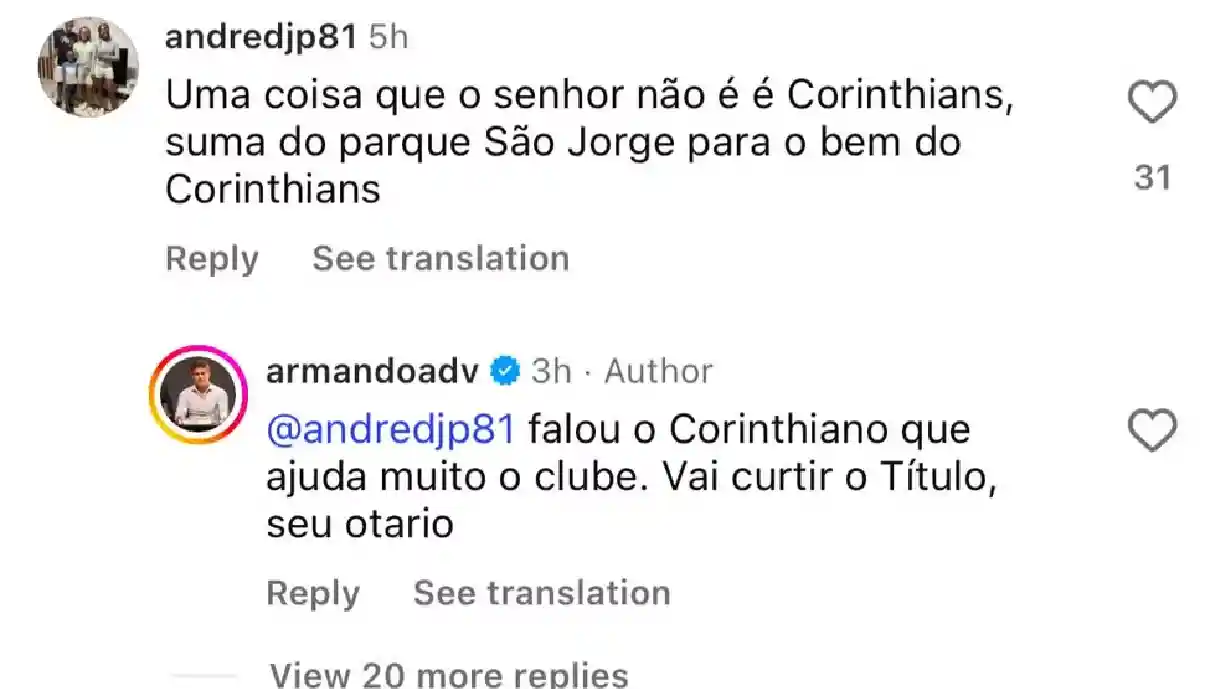 Nos comentários, alguns torcedores pediram sua saída do cargo. Em resposta, Armando escreveu: “Por quê? Tirei o presidente que roubava, dei uma Copa do Brasil e ainda reclama?”. Em outro momento, ao rebater críticas, chamou um internauta de “otário”, o que ampliou a repercussão do episódio