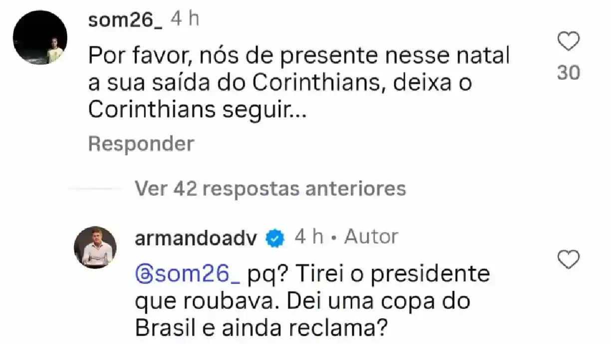 O vice presidente do Corinthians, Armando Mendonça, repercutiu nas redes sociais após responder a comentários de torcedores durante o feriado de Natal. A discussão ocorreu em uma publicação em que o dirigente celebrava as conquistas da temporada, incluindo a Copa do Brasil.